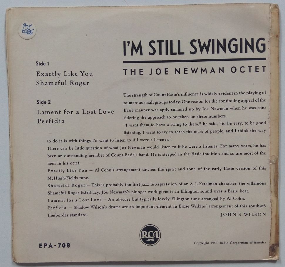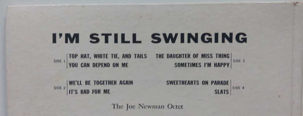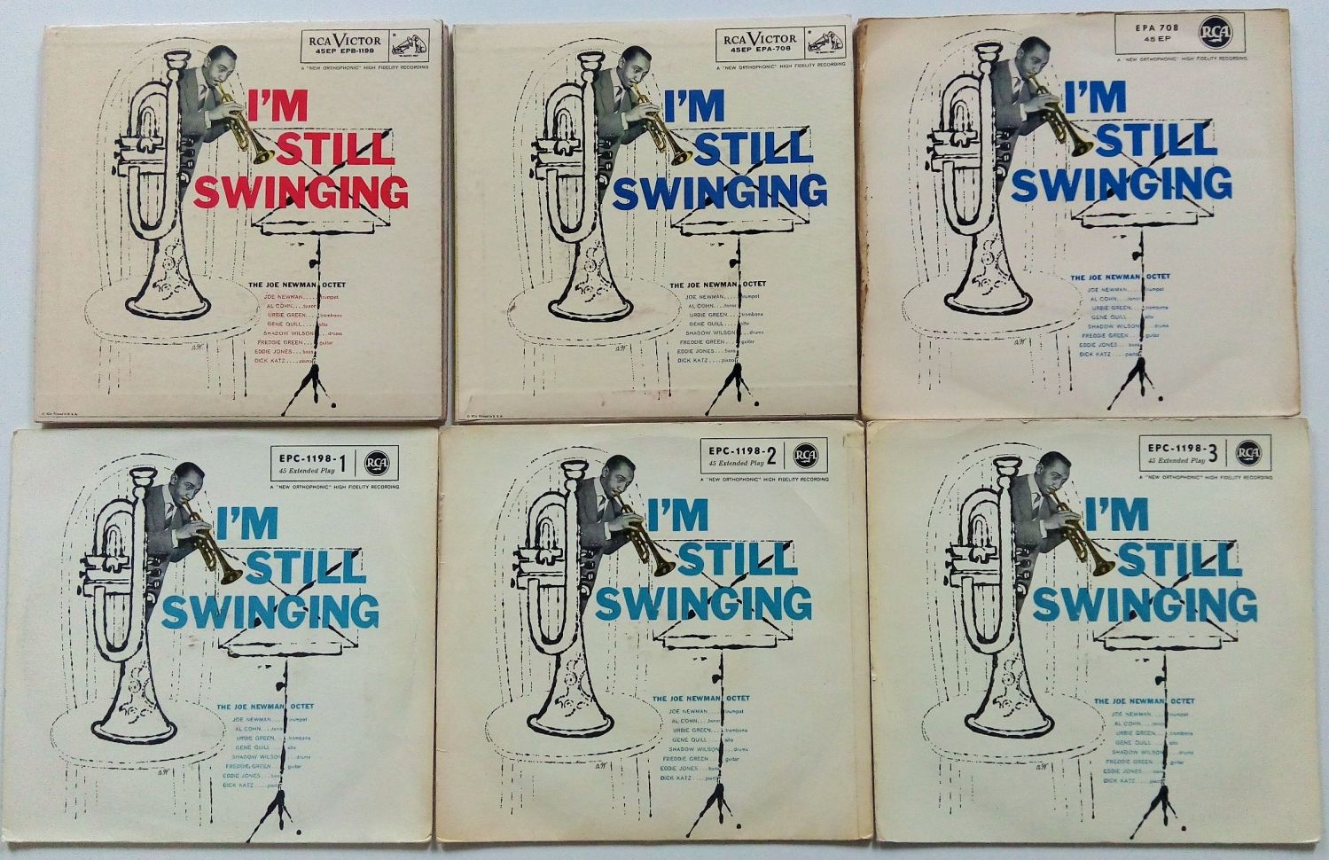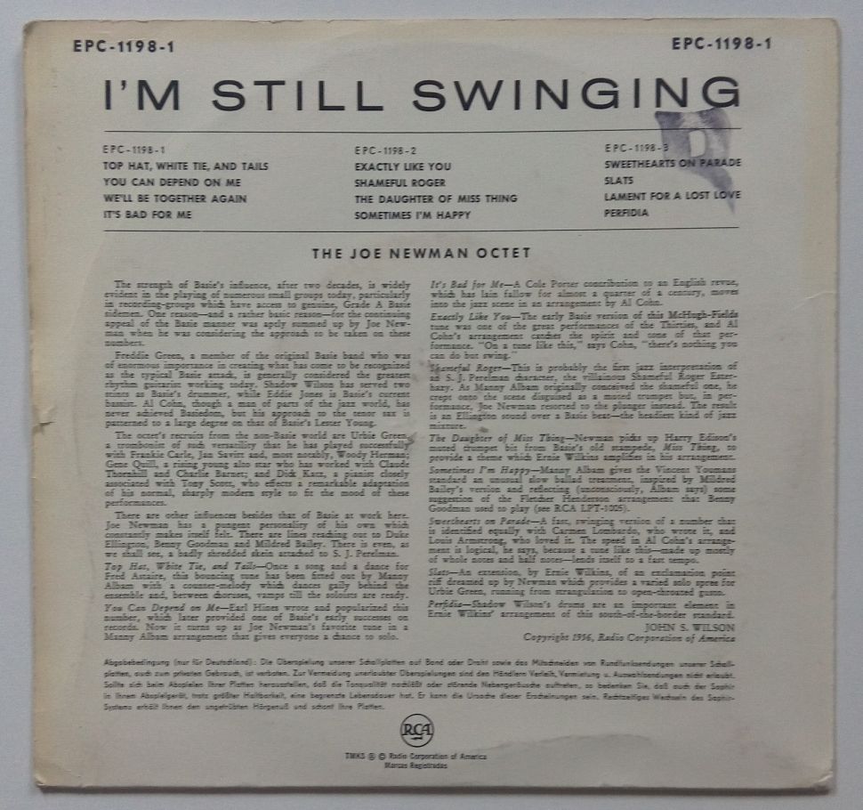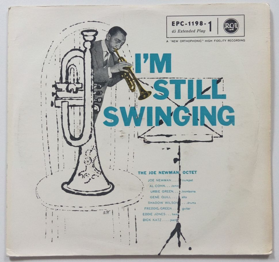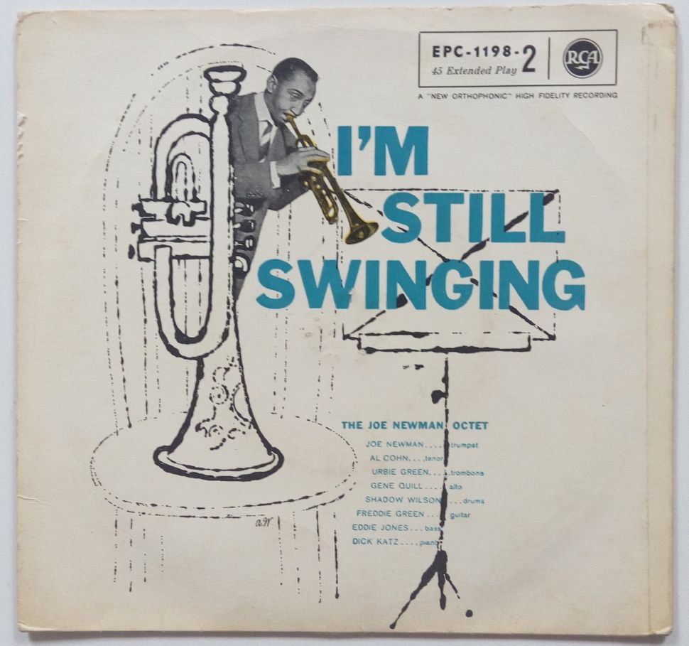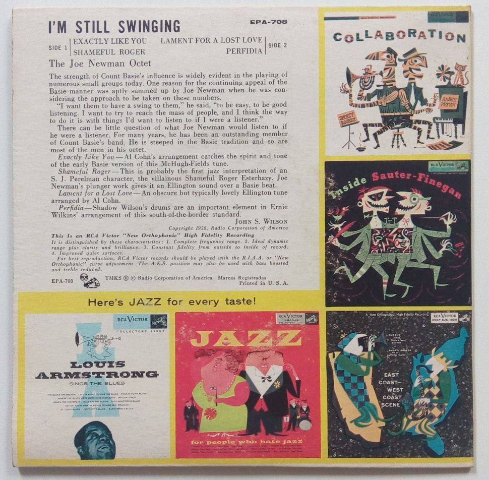 I’m starting a series of posts now about my single collection: Warhol on 45. First one in line is Joe Newman’s I’m Still Swinging. Warhol delivered a blotted line drawing, but whoever did the design has not been credited. Often you read that a difference in design between LP cover and EP cover is the color of lettering: red on the LP, blue on the EP cover. That is not entirely true: the double EP EPB-1198 with gatefold cover, which most likely was the first to be issued, has the same red lettering. This record contains 8 tracks.