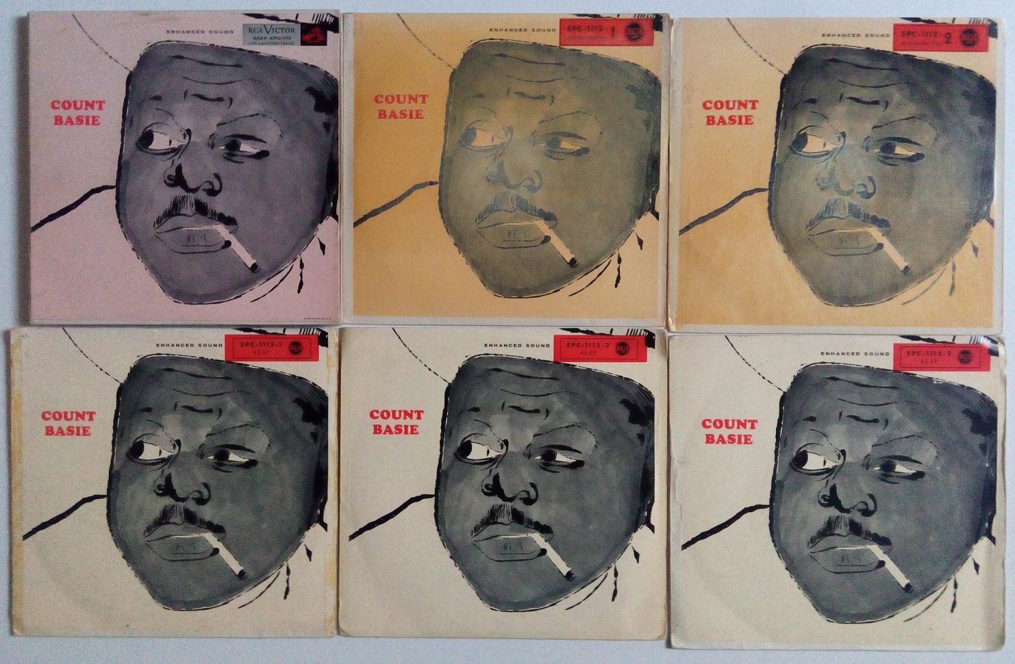 In 1955 RCA Victor released a Count Basie album – without a title – that had a beautiful Warhol portrait of the Count on the cover. The complete album was also released on 7 inch, in a great triple gatefold cover (EPC-1112).