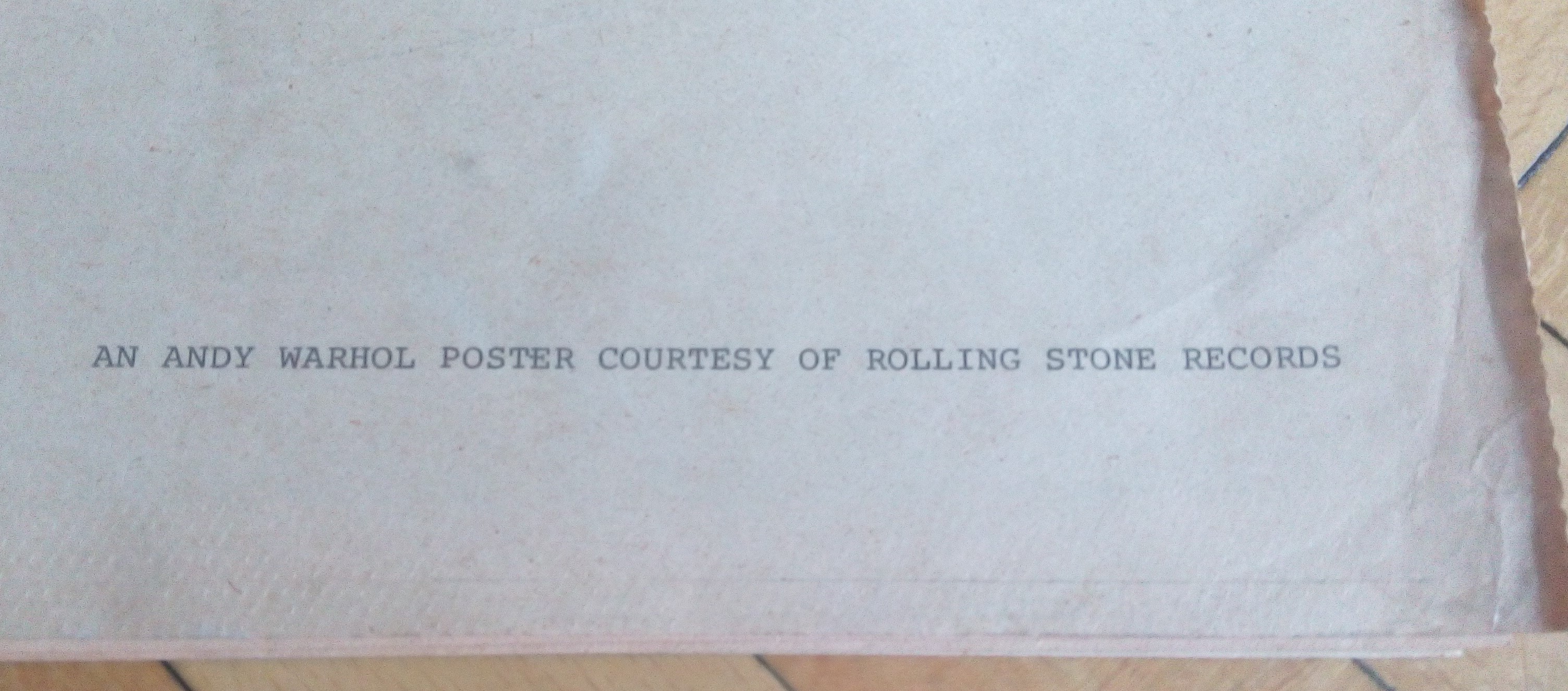 This type of poster often turns up on eBay or other sites: it has the original artwork of Love You Live, without lettering, how Warhol intended the cover to be. It’s printed on cheap newspaper-quality paper, and on the back is the text: “An Andy Warhol poster courtesy of Rolling Stone Records.”  I have wondered for years who has issued this poster. It is not included in Paul Maréchal’s catalogue of commissioned Warhol posters, probably because the source of it was unknown.
