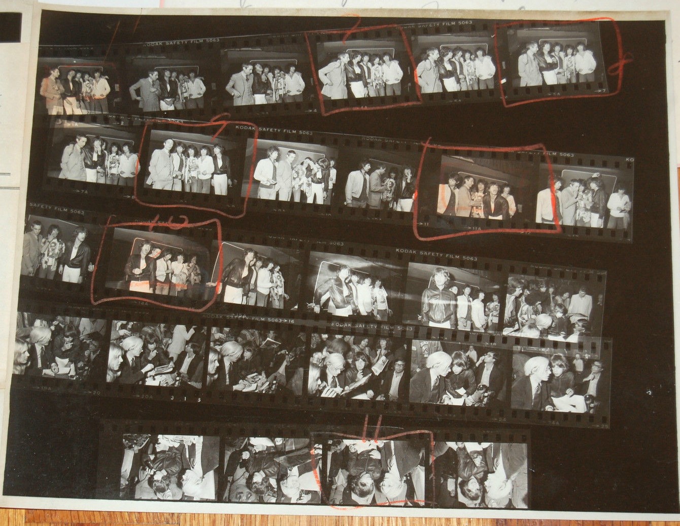 As seen on eBay: contact sheet of pictures by press photographer Terence McCarten at the Love You Live record launch, at the Trax in New York. Top three rows: band photoshoot. Lower two rows: Andy Warhol and Mick Jagger signing albums (and posters). The man sitting at the right is Interview’s editor Bob Colacello.