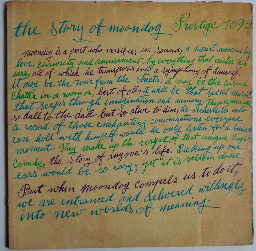 In 1957 Reid Miles did the design for The Story Of Moondog, an album by the blind avant garde musician and street poet and performer Louis Hardin a.k.a. Moondog, who in New York was also known as the “Viking Of 6th Avenue” because of his horned helmet. An artist that intriguing, deserved an equally intriguing album cover. Miles filled the cover completely with a poem about Moondog by Stewart Preston, in Julia Warhola’s curly handwriting.