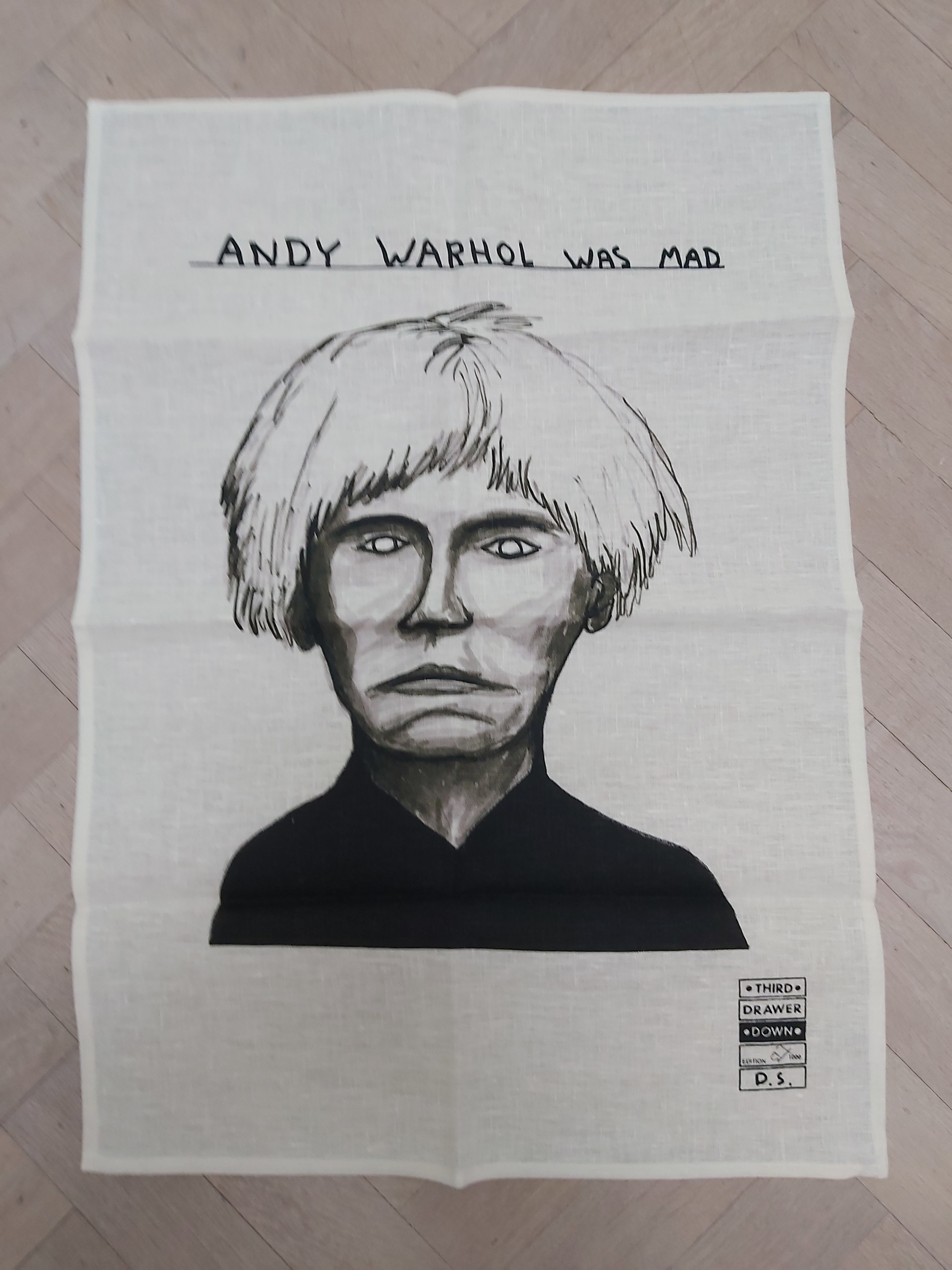 Also the Warhol portrait at the back of the Castle Face album had its second life. In 2012 the Australian company Third Drawer Down, who have a longduring working relationship with Shrigley, has produced the “Andy Warhol Was Mad” silkscreen, printed on a linen tea towel (limited edition of 1000 towels).