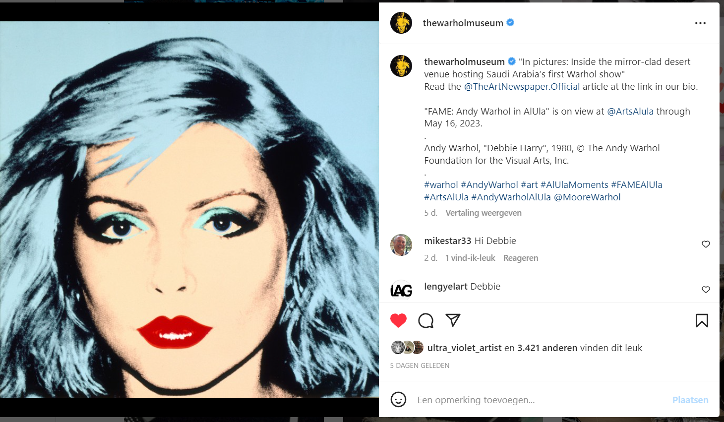 The blue Debbie Harry, by the way, is one of the works on view at the first ever Andy Warhol exhibition in Saudi Arabia: “Fame: Andy Warhol in AlUla”. The Andy Warhol Museum in Pittsburgh collaborated on this exhibition, see below a screenshot of an Instagram post from The Warhol.